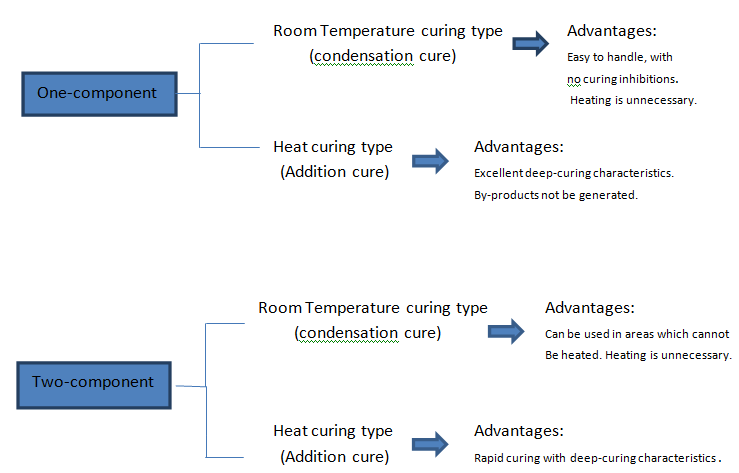 سیلیکون های RTV جهت پخت شدن نیازمند دمای بالا نبوده و در دمای محیط عملیات پلیمریزاسیون صورت میگیرد . این سیلیکون ها در دو صورت تک و جزئی و دو جزئی عرضه میگردند .